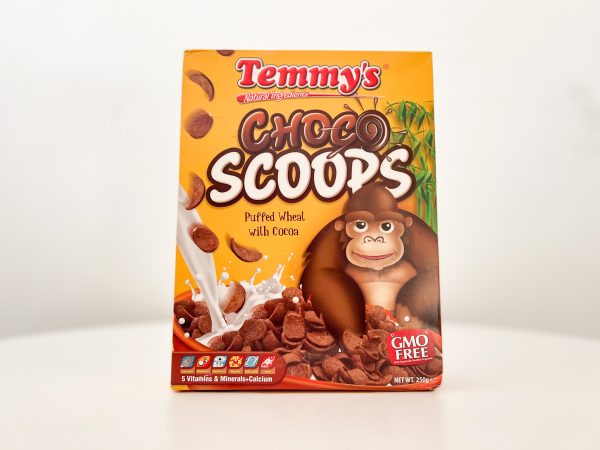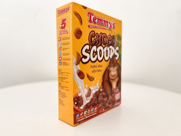Temmy’s Choco Scoops – Cereal. Serving Size : 30 g. 150Cal. 85%25gCarbs. 8%1gFat. 7%2gProtein